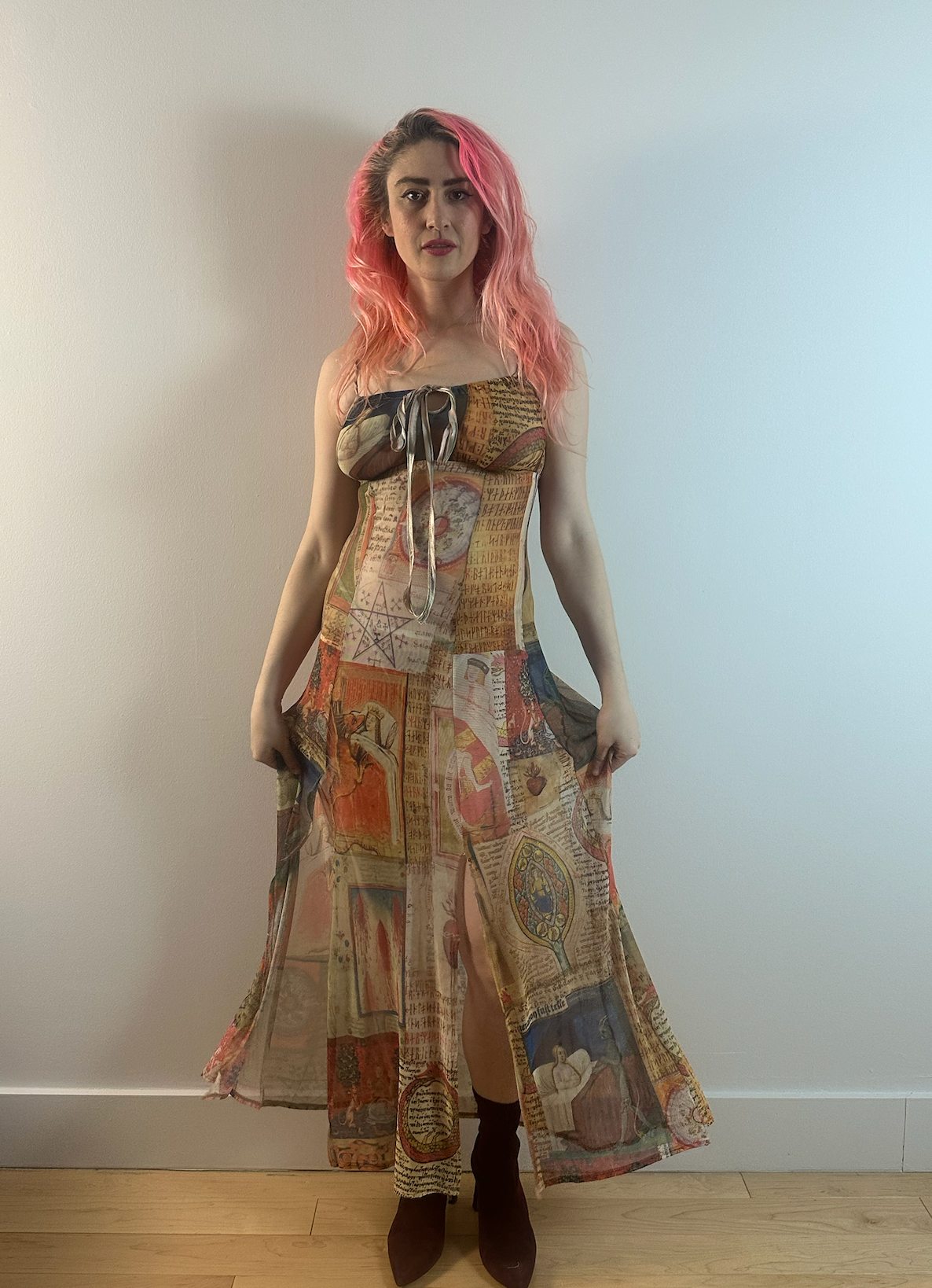 This is a full-length, high-slit maxi dress made for the perfectly hot and off-putting spring wardrobe. The prints here include the Rawlinson manuscript, another grimoire page written in runes, an ouroboros, and several unhinged medieval women either decapitating men or chatting it up with the devil. The sizing is very standard, and the material is all-around soft stretch mesh for a very comfy, airy fit.