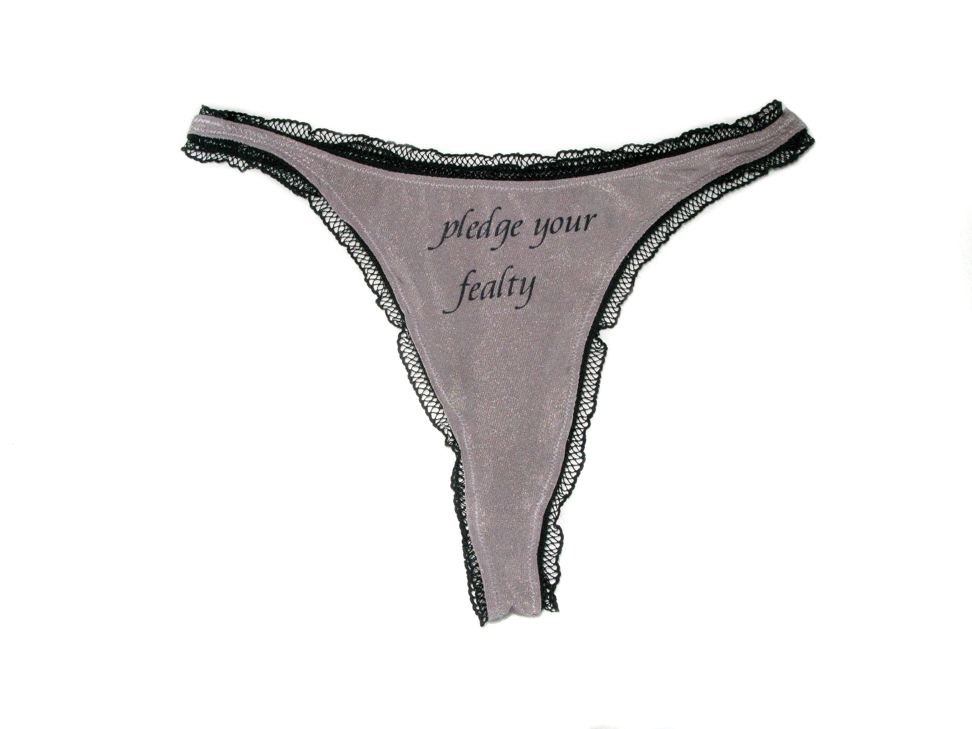 Made from metallic lilac deadstock spandex, this hand-sewn thong is designed for getting them to swear an unbreakable vow of loyalty.