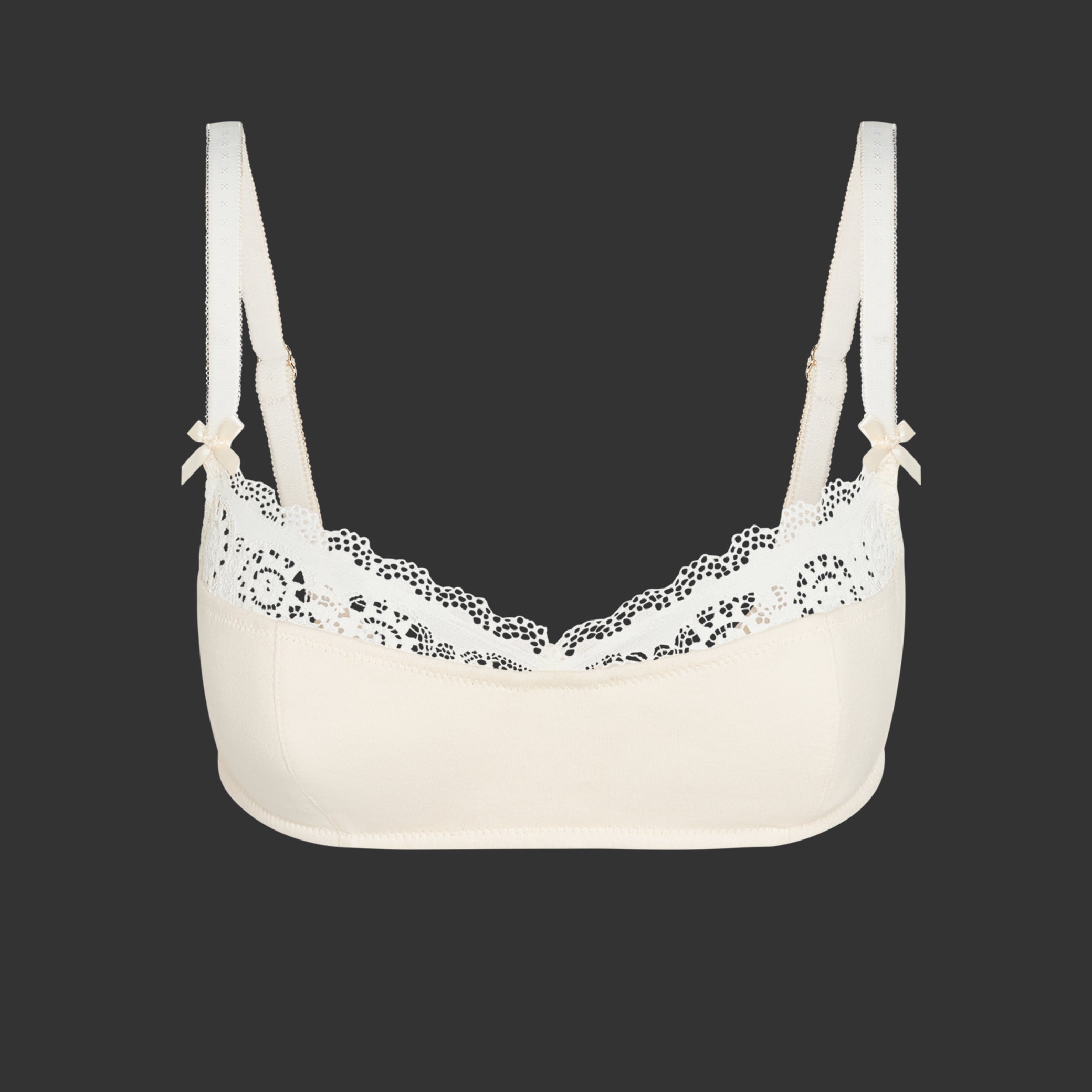This is our first-ever bra, inspired by vintage muses like Brigitte Bardot, Sophia Loren, and Josephine Baker. It's made by hand from 100% organic, undyed cotton interlock fabric, which means it's breathable, hypoallergenic, and totally non-toxic. It's finished with thick ivory lace sourced from France to add a little bit of stretch, and is designed for maximum comfort and everyday wear.